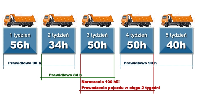 Zgodnie z ust 3 i 4 art 6 rozporządzenia 561/2006 WE tygodniowy czas prowadzenia pojazdu nie może przekroczyć 56 godzin, a łączny czas prowadzenia pojazdu w ciągu dwóch kolejnych tygodni nie może przekroczyć 90 godzin.